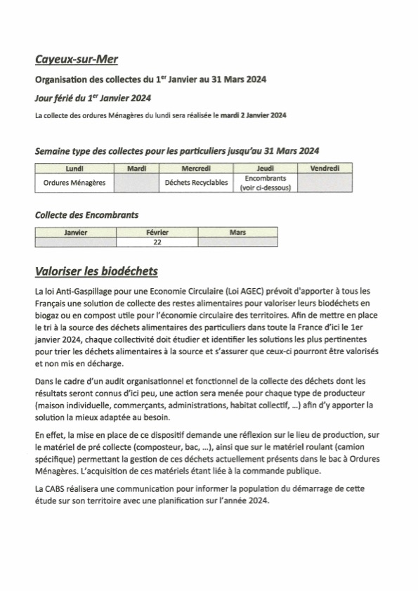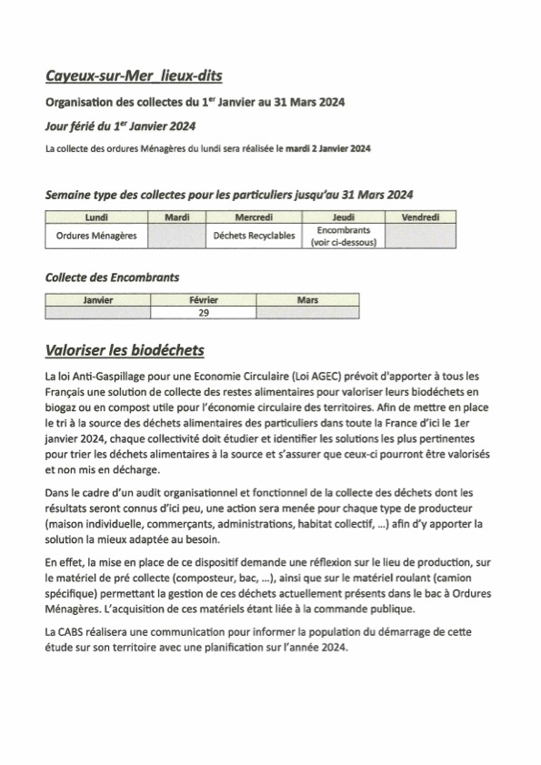 Pour le mois de février 2024, la collecte des encombrants aura lieu le 22 février pour le bourg de Cayeux et le 29 février pour les lieux-dits.