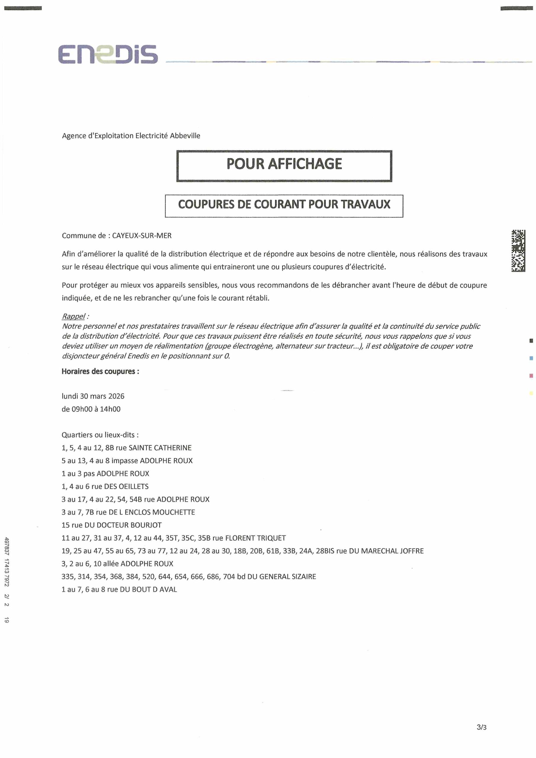 Pour effectuer des travaux sur le réseau, Enedis procédera à des coupures temporaires de courant lundi 30 mars 2026 à Cayeux-sur-Mer. Merci de consulter l'affiche ci-dessous pour connaitre le détail des rues concernées :