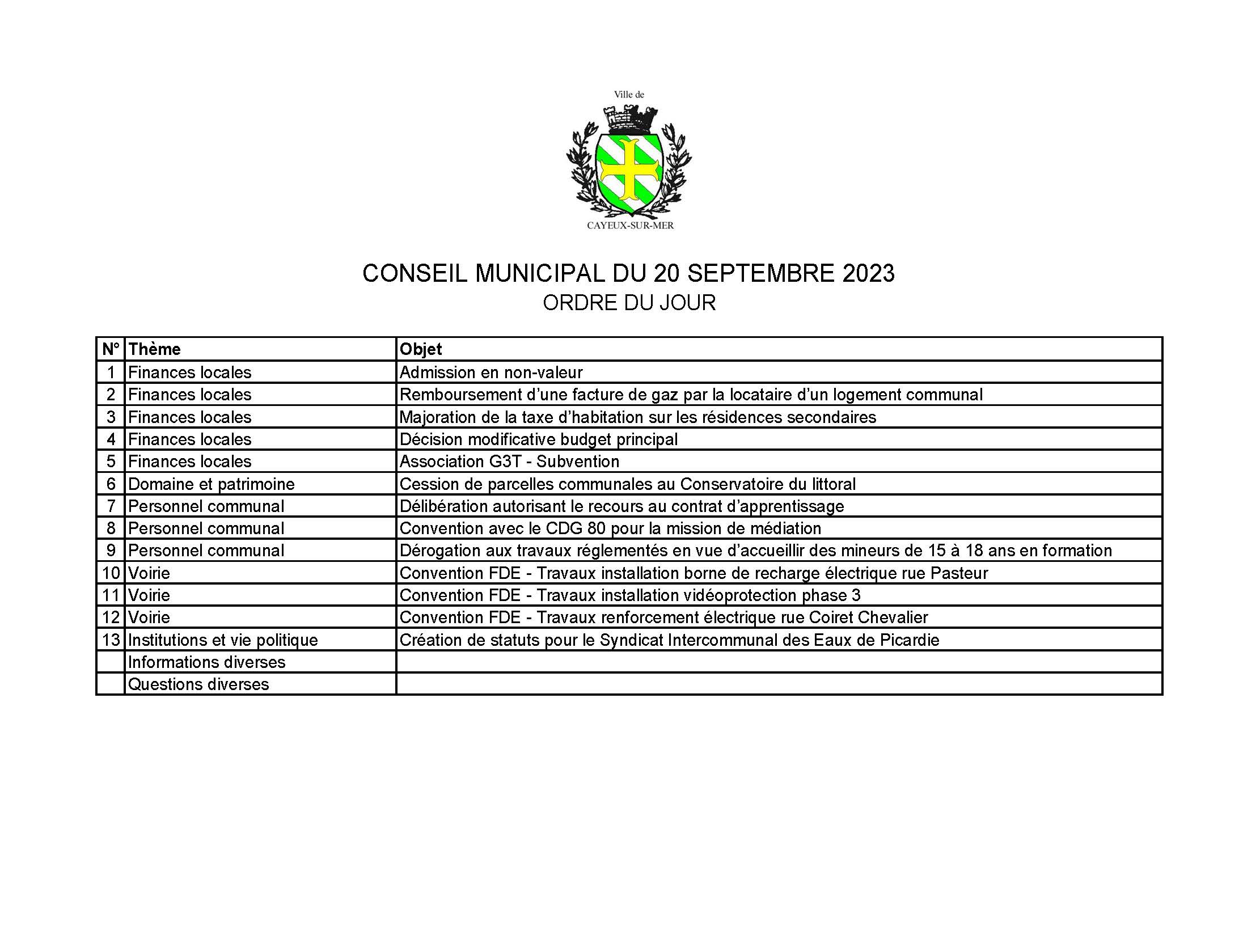 Le conseil municipal de Cayeux-sur-Mer se réunira en salle d'honneur de  la mairie le mercredi 20 septembre 2023 à 18 h.