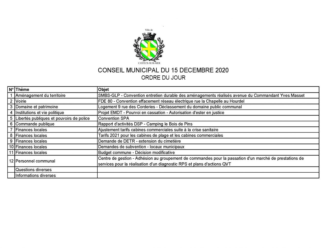 Le conseil municipal se réunira le 15 décembre 2020 à 18h en salle d'honneur de la mairie de Cayeux-sur-Mer. Compte-tenu des précautions sanitaires en vigueur, l'assemblée se tiendra à huis-clos.