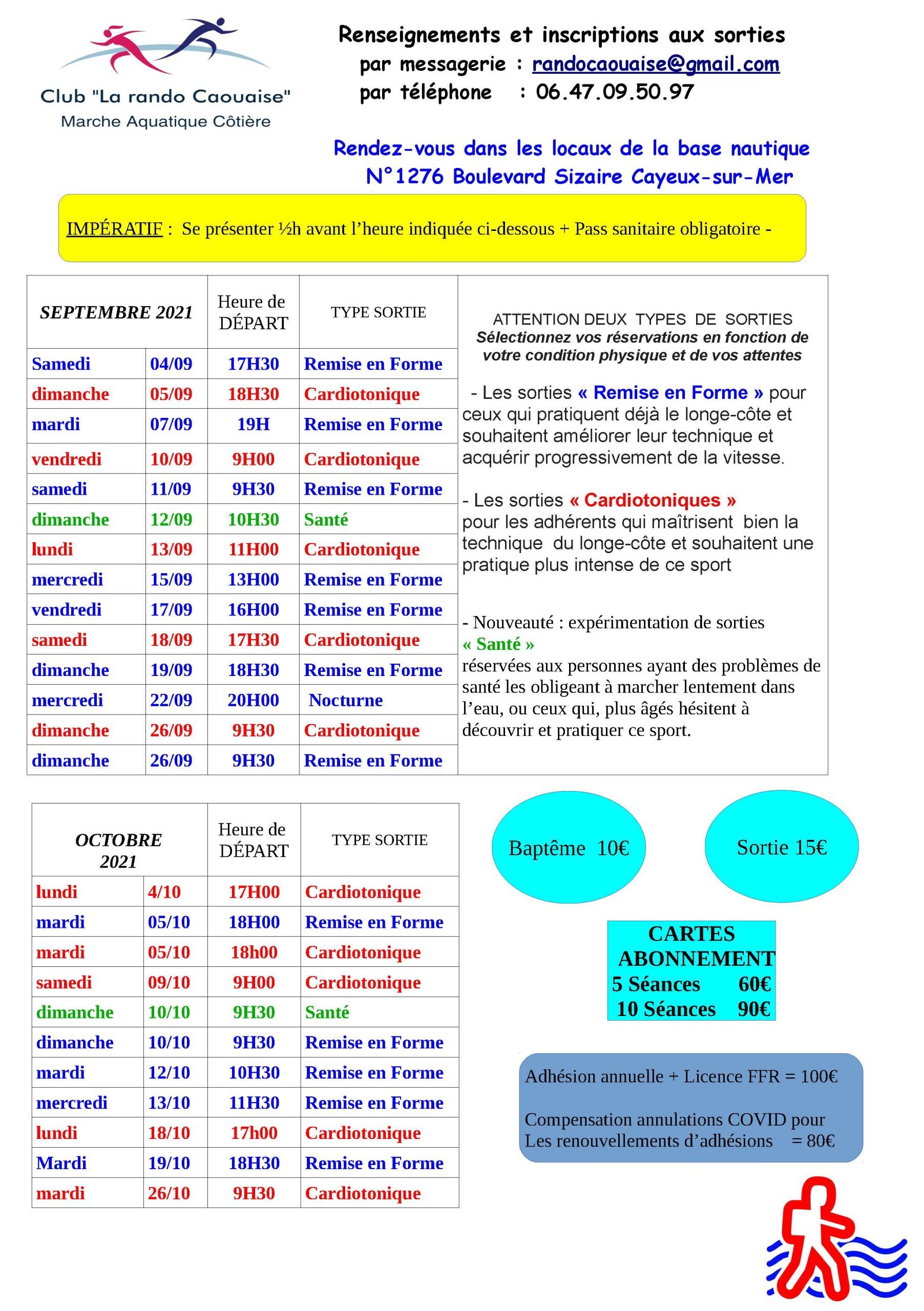 Le club de longe-côte, la Rando Caouaise organise des séances de remise en forme, cardio ou cardiotonique organisées selon le calendrier ci-dessous.