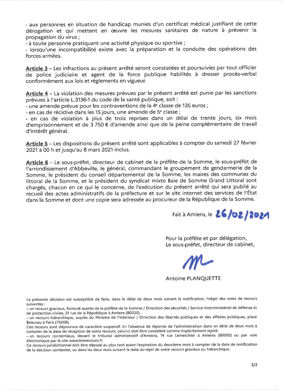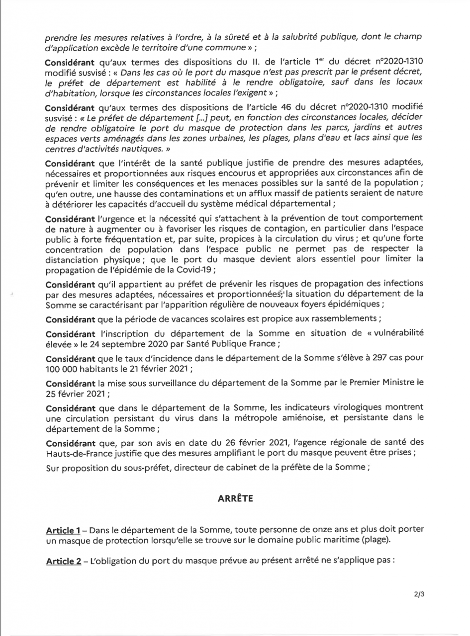 Au vu de cette situation, la préfète de la Somme a décidé de renforcer dès le samedi 27 février les mesures de sécurité sanitaire en rendant le port du masque obligatoire sur les plages du département pour les personnes de onze ans et plus.